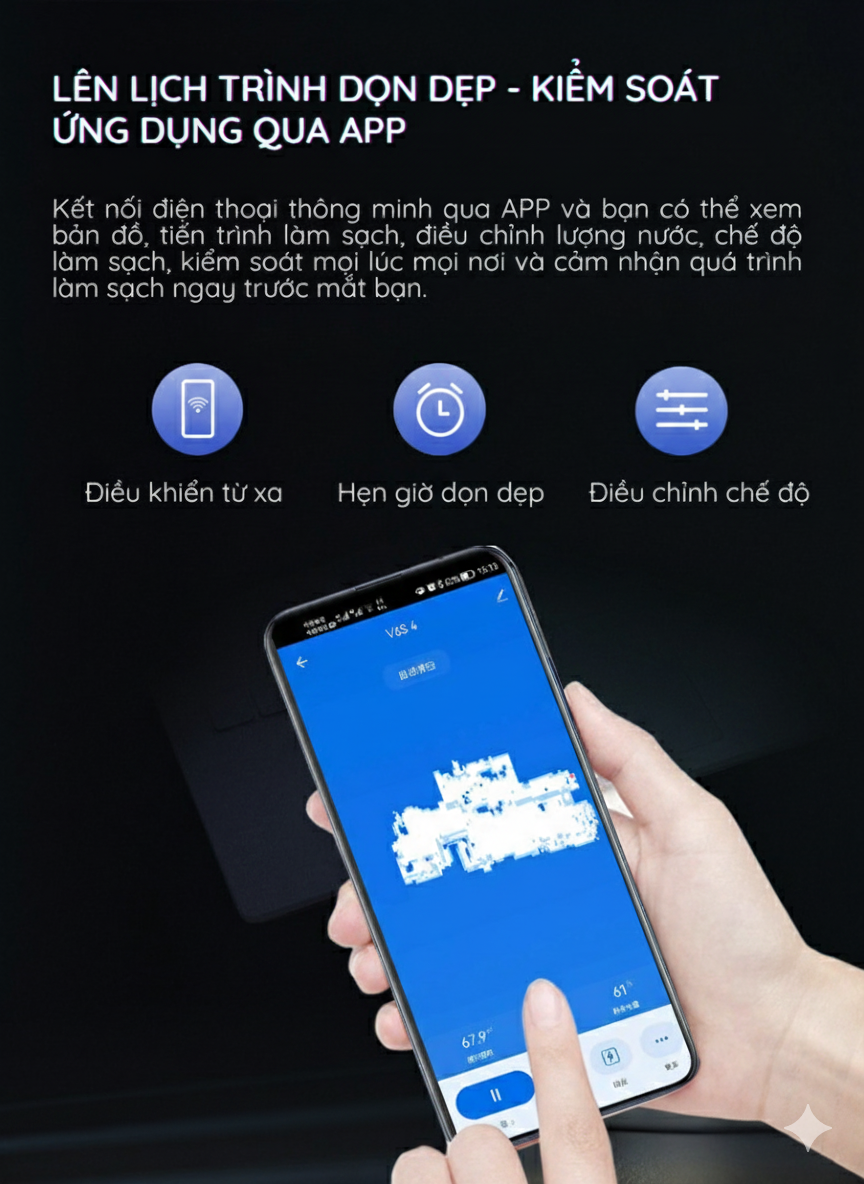 • Kết nối với điện thoại thông minh qua APP để xem bản đồ, điều chỉnh lượng nước, chế độ làm sạch và kiểm soát từ xa.