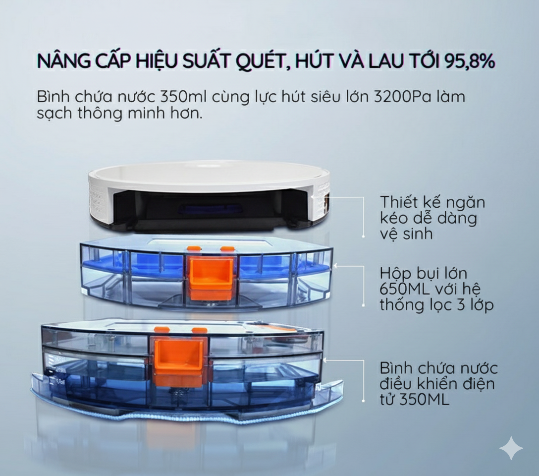 1. Nâng Cấp Hiệu Suất Quét, Hút và Lau Tới 95,8%