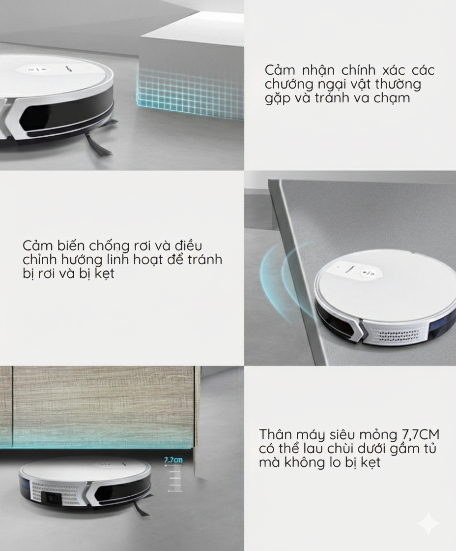 • Cảm biến chống rơi, nhận diện chướng ngại vật và điều hướng linh hoạt.