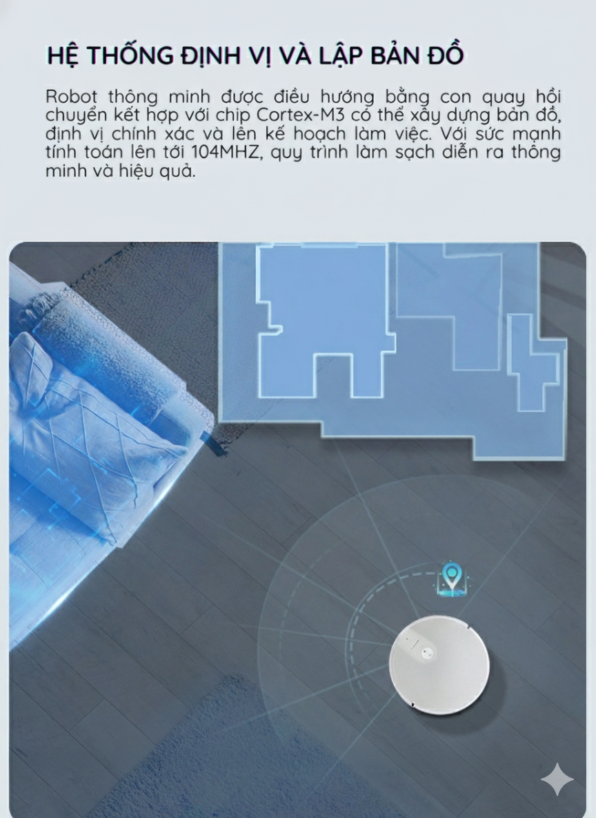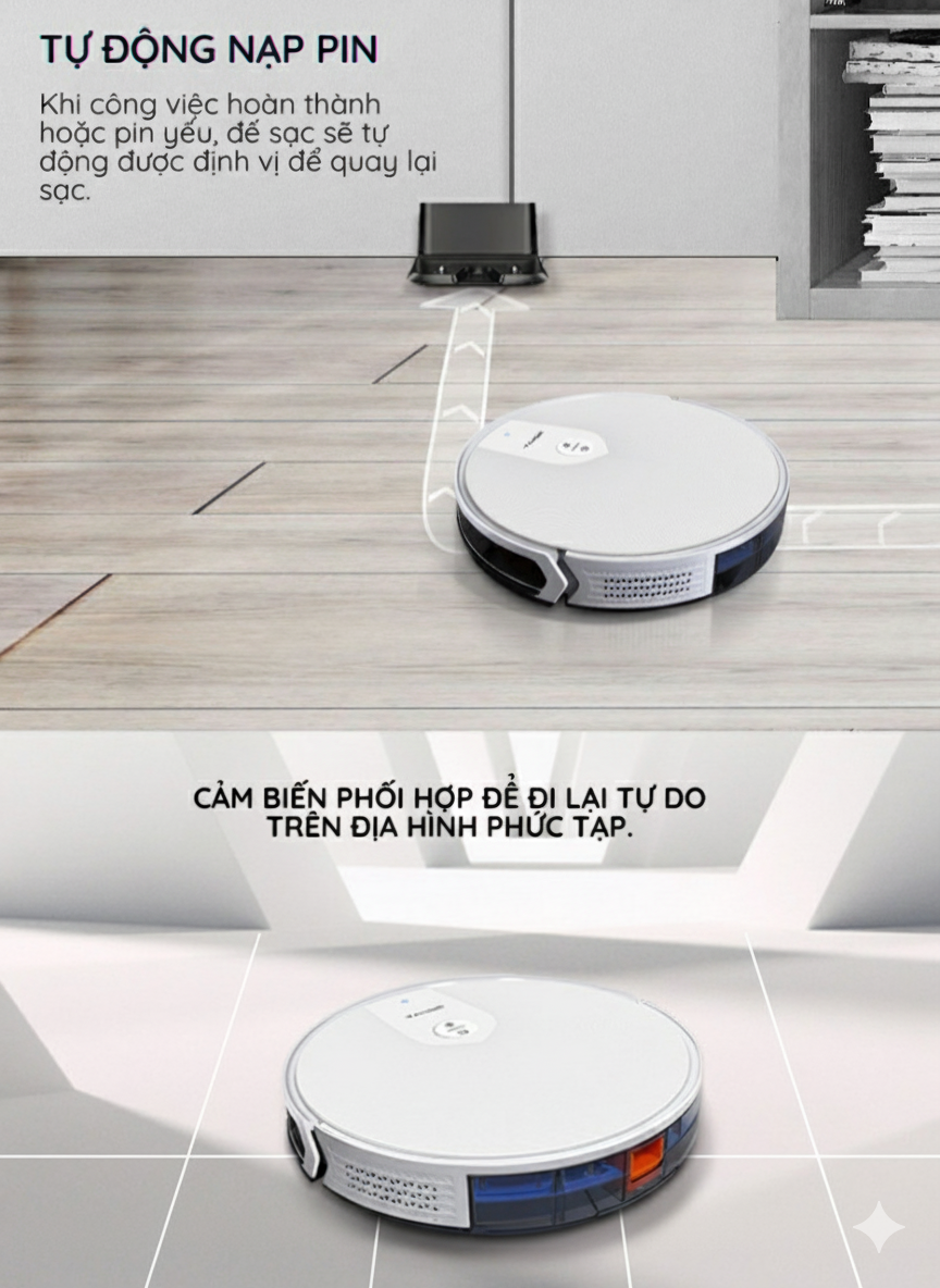 • Tự động quay về sạc khi pin yếu hoặc hoàn thành công việc.