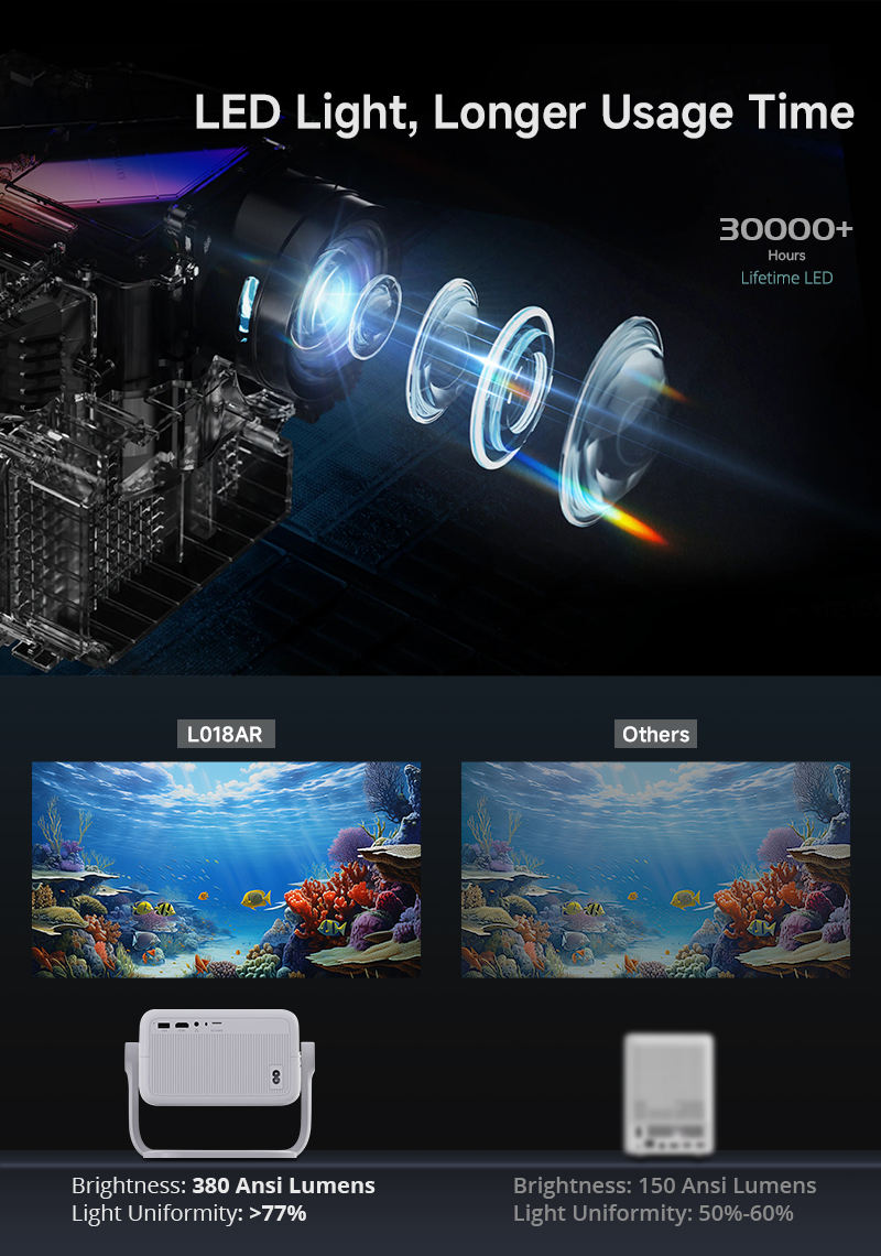 - Tuổi thọ đèn LED: Lên đến 30.000 giờ, nghĩa là bạn có thể xem phim liên tục trong 10-15 năm mà không cần thay bóng.