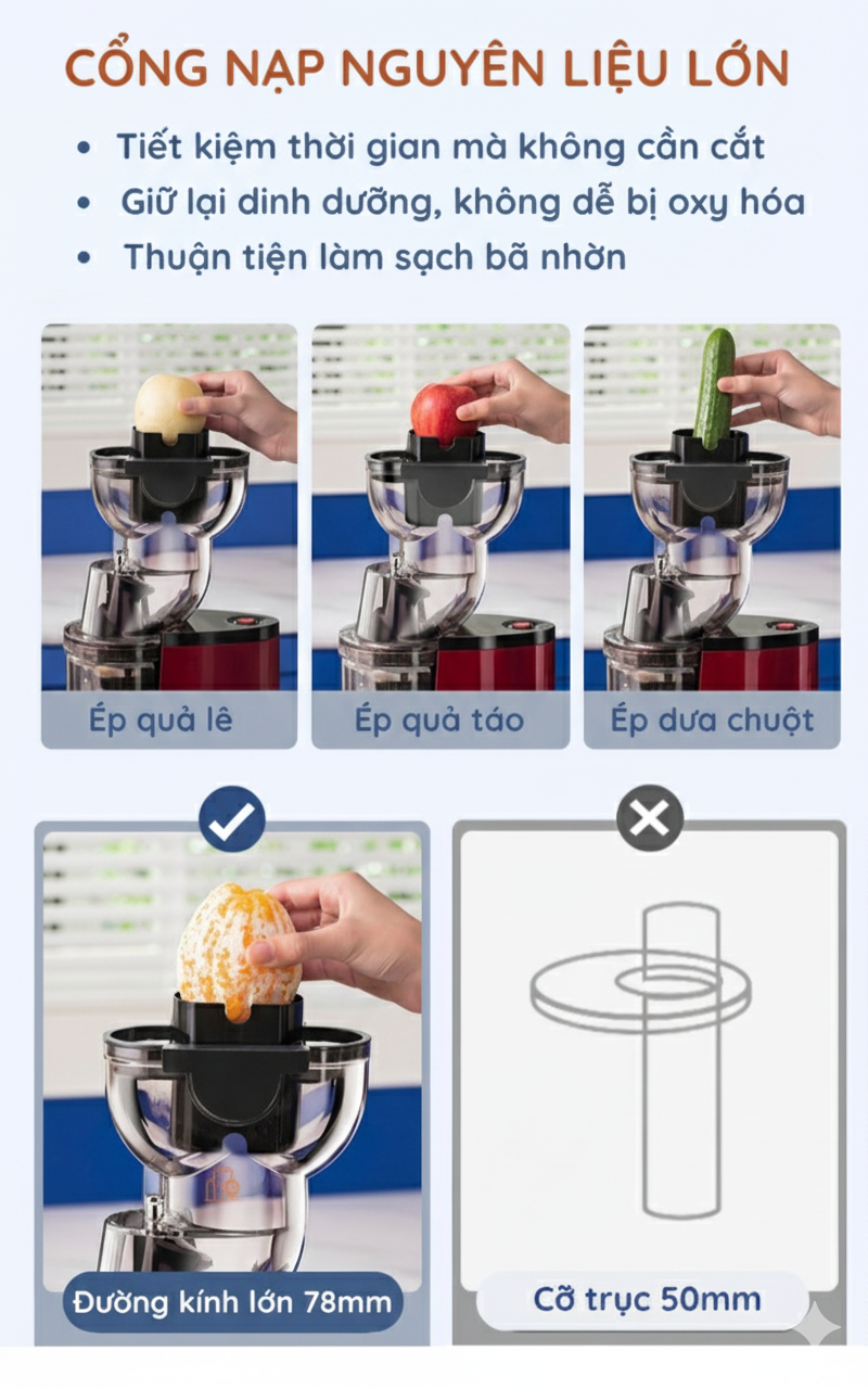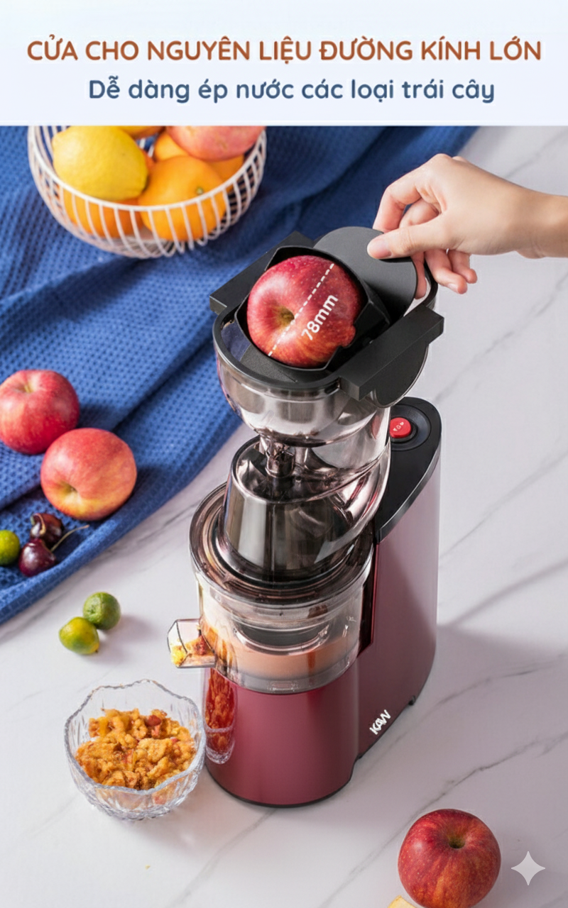 Máy ép chậm KAW có đường kính cửa nạp lên tới 78mm, giúp bạn có thể ép nguyên trái táo, lê hoặc dưa chuột mà không cần cắt nhỏ, tiết kiệm thời gian chế biến.