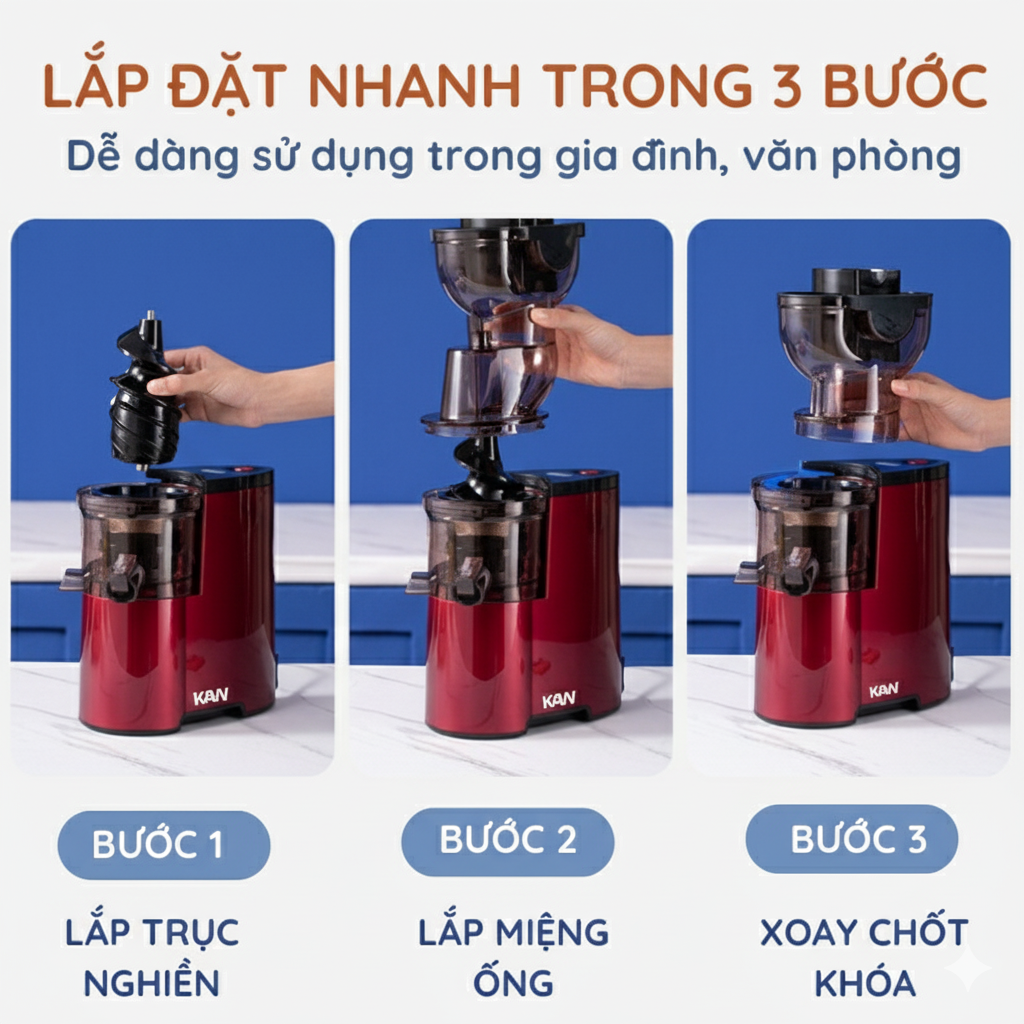 Với thiết kế tháo rời từng bộ phận, việc vệ sinh máy ép chậm KAW trở nên vô cùng đơn giản. Chỉ với một lần xả nước, máy sẽ sạch hoàn toàn, tiết kiệm thời gian và công sức.